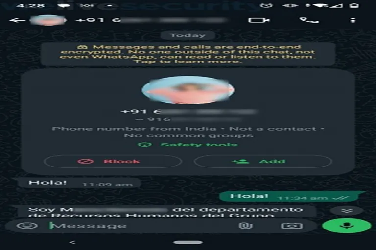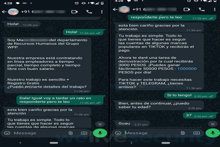 1. Contacto inicial: La víctima recibe un mensaje de WhatsApp proveniente de un número telefónico de la India. El mensaje está escrito en español, lo cual resulta sospechoso a primera vista. El remitente se presenta como miembro de la empresa “WPP”, lo que podría ser un intento de confundir a la víctima haciéndola pensar que refiere a WhatsApp. Sin embargo, existe una empresa legítima llamada WPP.